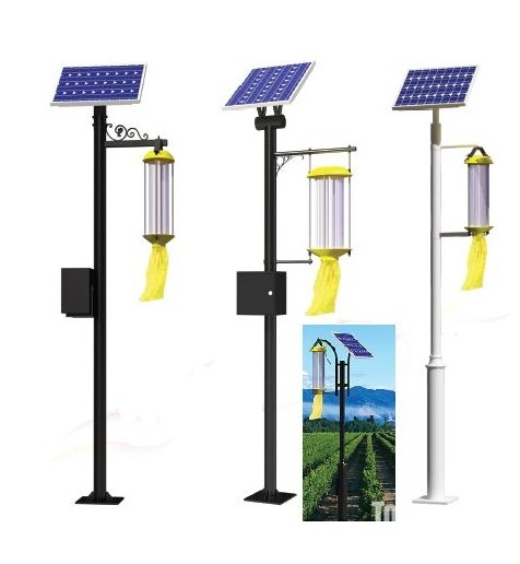 太阳能灭蚊灯是利用太阳能电池板作为用电来源,利用昆虫具有激备较强的趋光、趋波、趋色、趋性的特性原理,引诱害虫扑向灯的光源,光源外配置高压击杀网,达到灭害虫的目的。