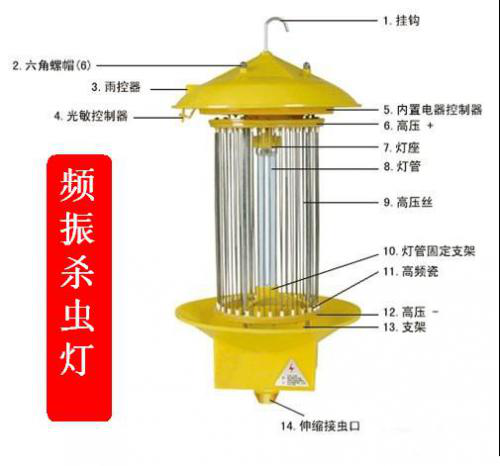 太阳能灭蚊灯是利用太阳能电池板作为用电来源,利用昆虫具有激备较强的趋光、趋波、趋色、趋性的特性原理,引诱害虫扑向灯的光源,光源外配置高压击杀网,达到灭害虫的目的。